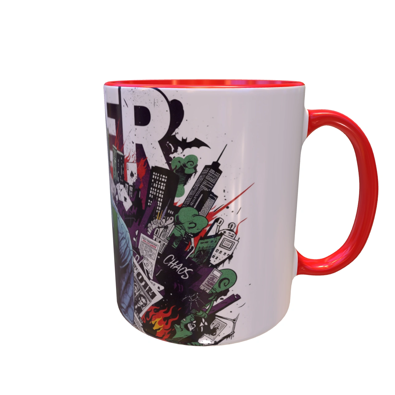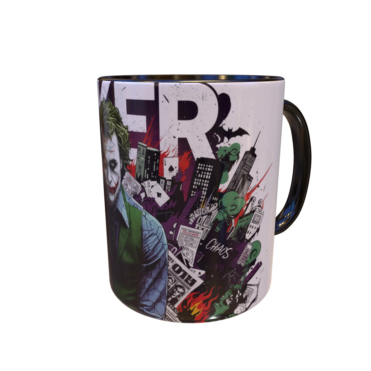 🃏 طراحی انفجاری و پرجزئیات! – چهره جوکر با آن گریم معروف و نگاه خیرهکننده، در مرکز ماگ قرار دارد و اطرافش پر از عناصر مرتبط با دنیای اوست: کارتهای جوکر، تکههای روزنامه با تیترهای هرج و مرج، و شبح شهر گاتهام. این طرح یک داستان کامل از آشوب را روایت میکند. 🎨 رنگبندی جسورانه! – ترکیب رنگهای بنفش، سبز و قرمز که نمادهای اصلی شخصیت جوکر هستند، در این ماگ به شکلی استادانه به کار رفتهاند.