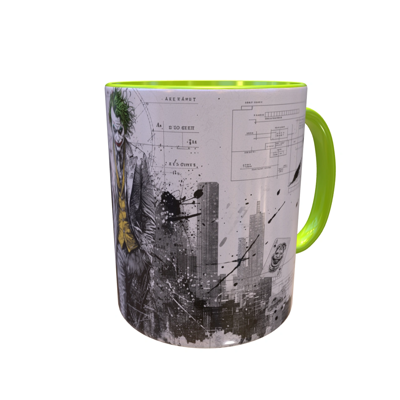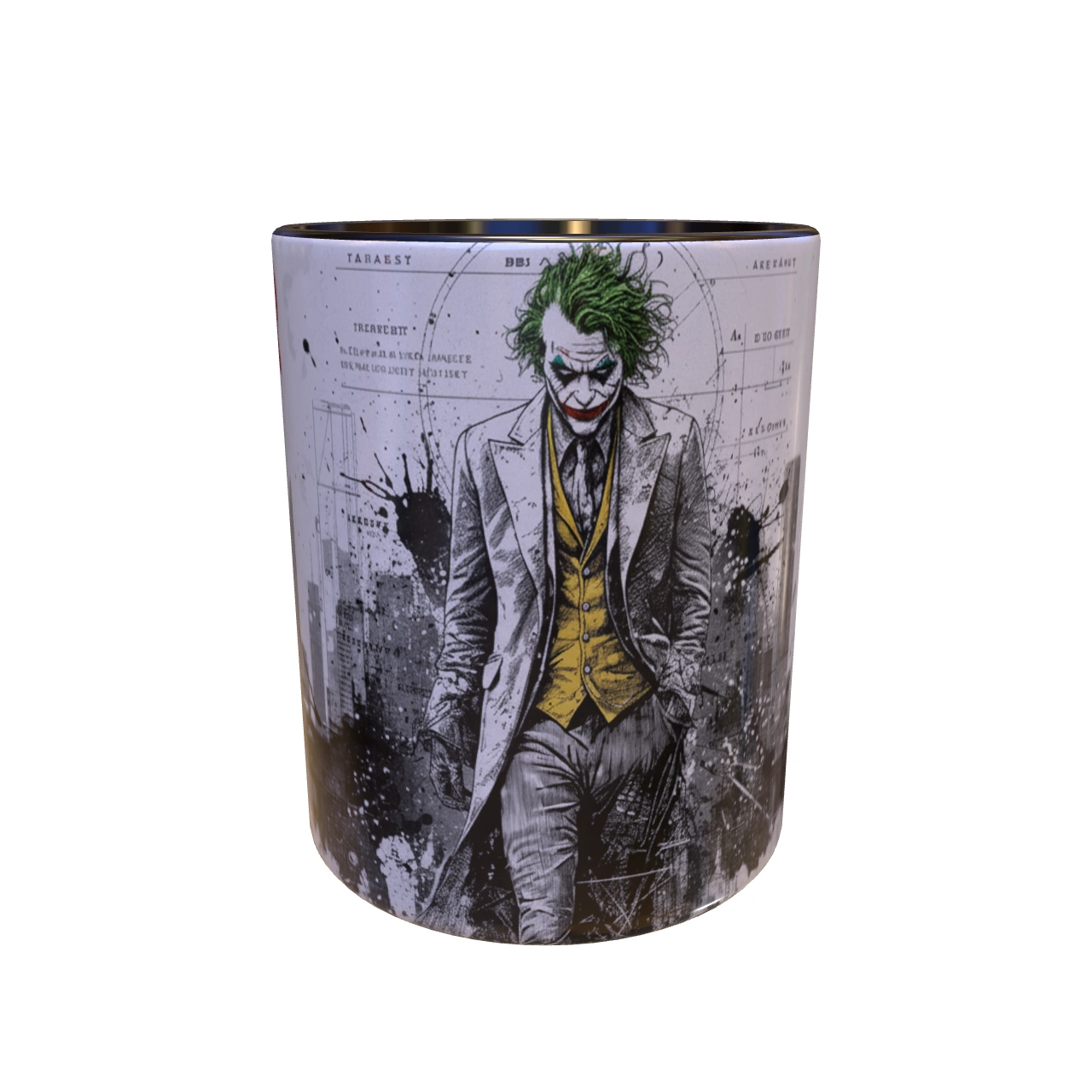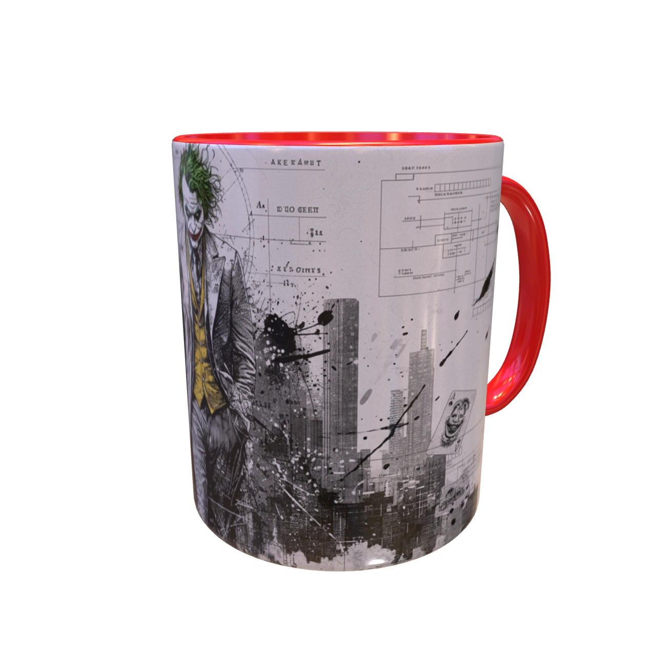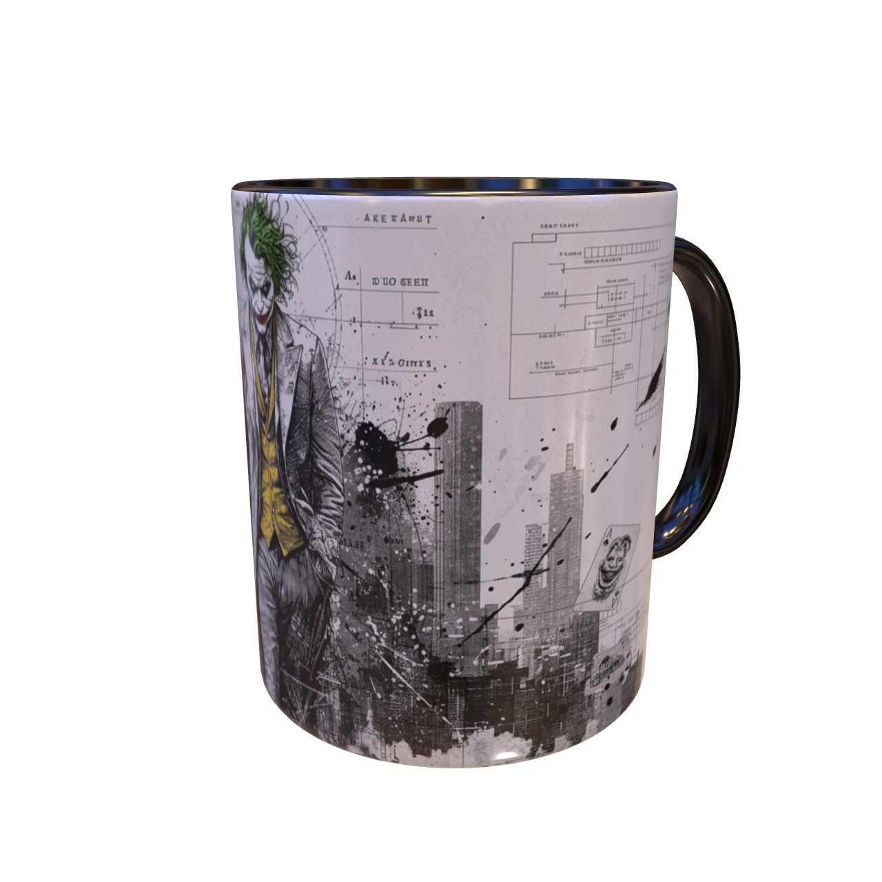 🏙️ تحلیل طرح: معمار یا آنارشیست؟ – این یک پرتره ساده از دشمن بتمن نیست. ترکیب تصویر اسکیسمانند جوکر با پسزمینهای از دیاگرامها، نقشههای فنی و خطوط شهری، این سوال را مطرح میکند: آیا او قربانی شهر است یا معمار ویرانی آن؟ لکههای جوهر و رنگ پاشیده شده، نماد انفجار روانی و هرجومرجی است که از دل نظم دروغین شهر بیرون میزند. 🎨 طراحی دوگانه و داستانی! – یک سمت ماگ، پرترهی کامل جوکر است که با اعتماد به نفس در حال قدم زدن است؛ نمادی از پذیرش هویت جدیدش. بچرخانید تا با سوی دیگر ماجرا روبرو شوید: فروپاشی شهر، کارتهای بازی و خندههای “HAHHAA!” که نشان میدهد بازی شروع شده است.