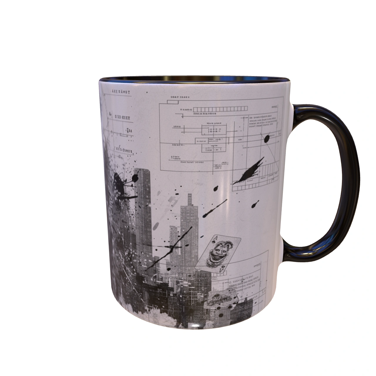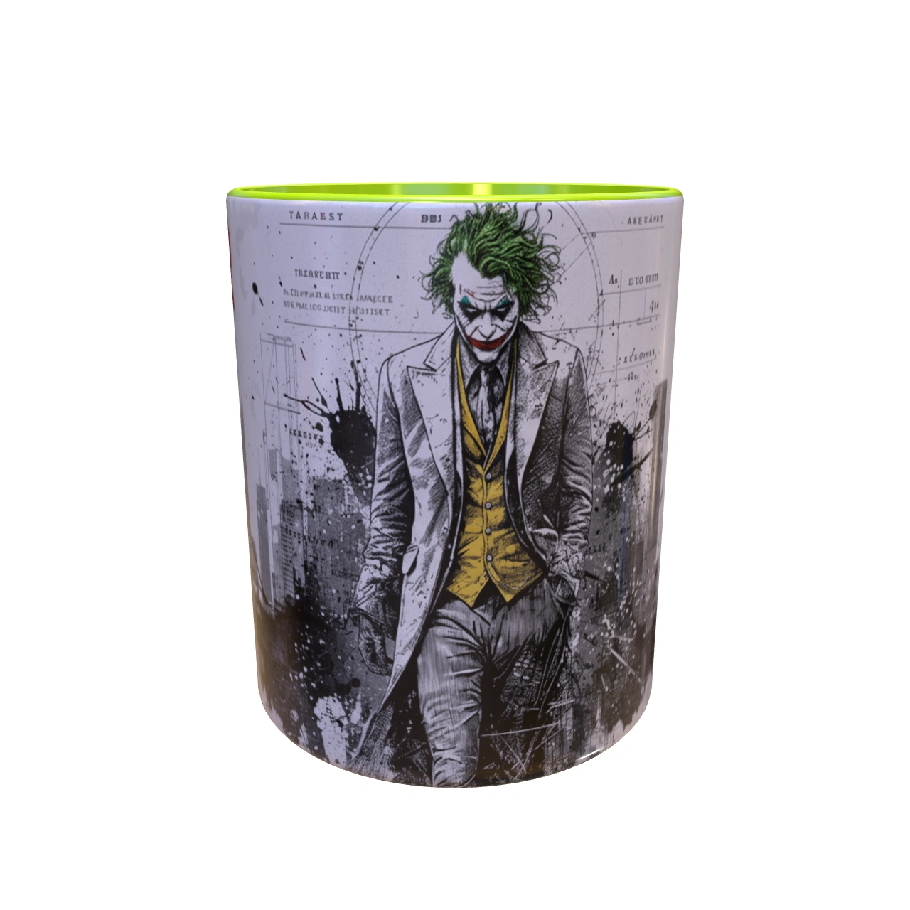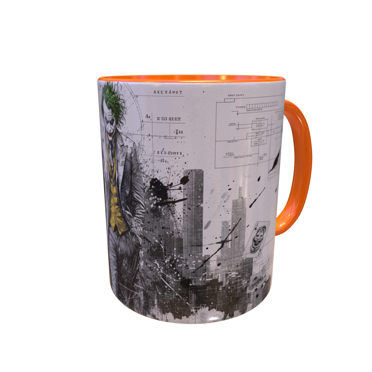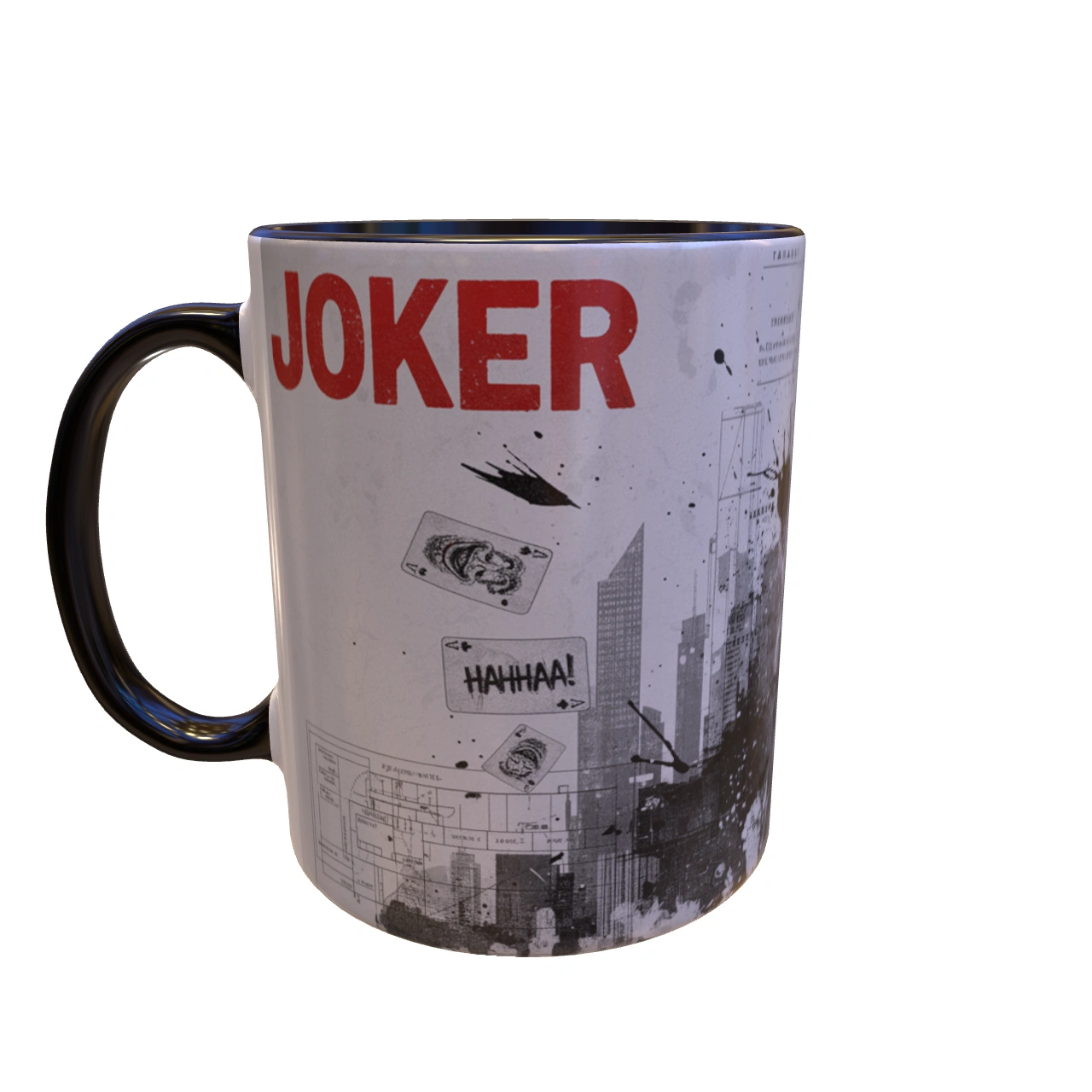 🏙️ تحلیل طرح: معمار یا آنارشیست؟ – این یک پرتره ساده از دشمن بتمن نیست. ترکیب تصویر اسکیسمانند جوکر با پسزمینهای از دیاگرامها، نقشههای فنی و خطوط شهری، این سوال را مطرح میکند: آیا او قربانی شهر است یا معمار ویرانی آن؟ لکههای جوهر و رنگ پاشیده شده، نماد انفجار روانی و هرجومرجی است که از دل نظم دروغین شهر بیرون میزند. 🎨 طراحی دوگانه و داستانی! – یک سمت ماگ، پرترهی کامل جوکر است که با اعتماد به نفس در حال قدم زدن است؛ نمادی از پذیرش هویت جدیدش. بچرخانید تا با سوی دیگر ماجرا روبرو شوید: فروپاشی شهر، کارتهای بازی و خندههای “HAHHAA!” که نشان میدهد بازی شروع شده است.