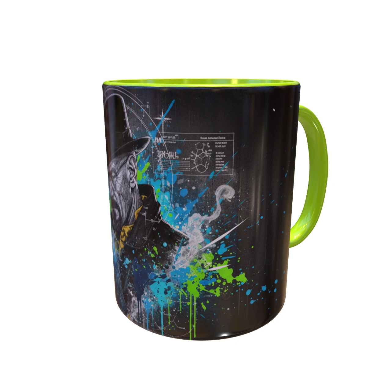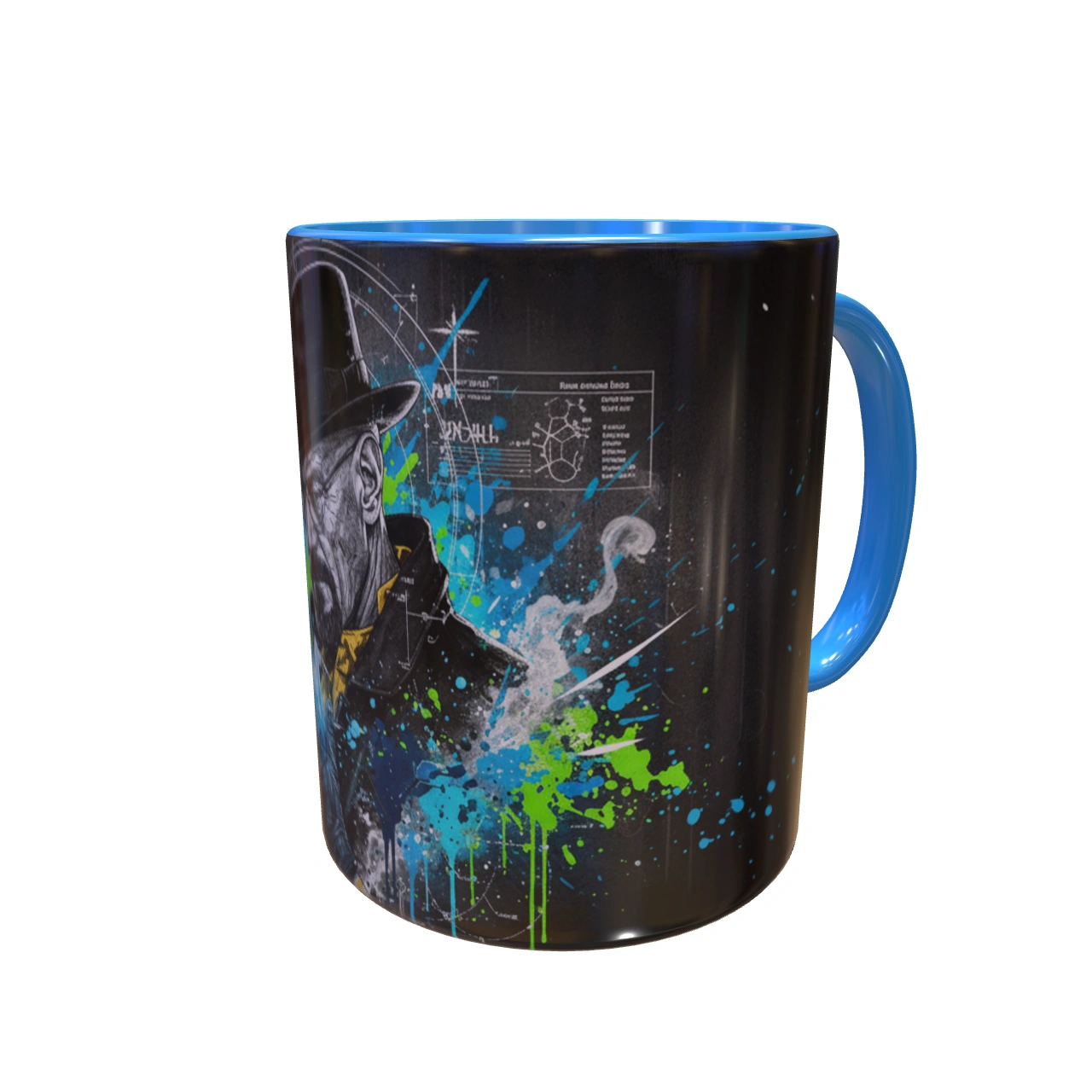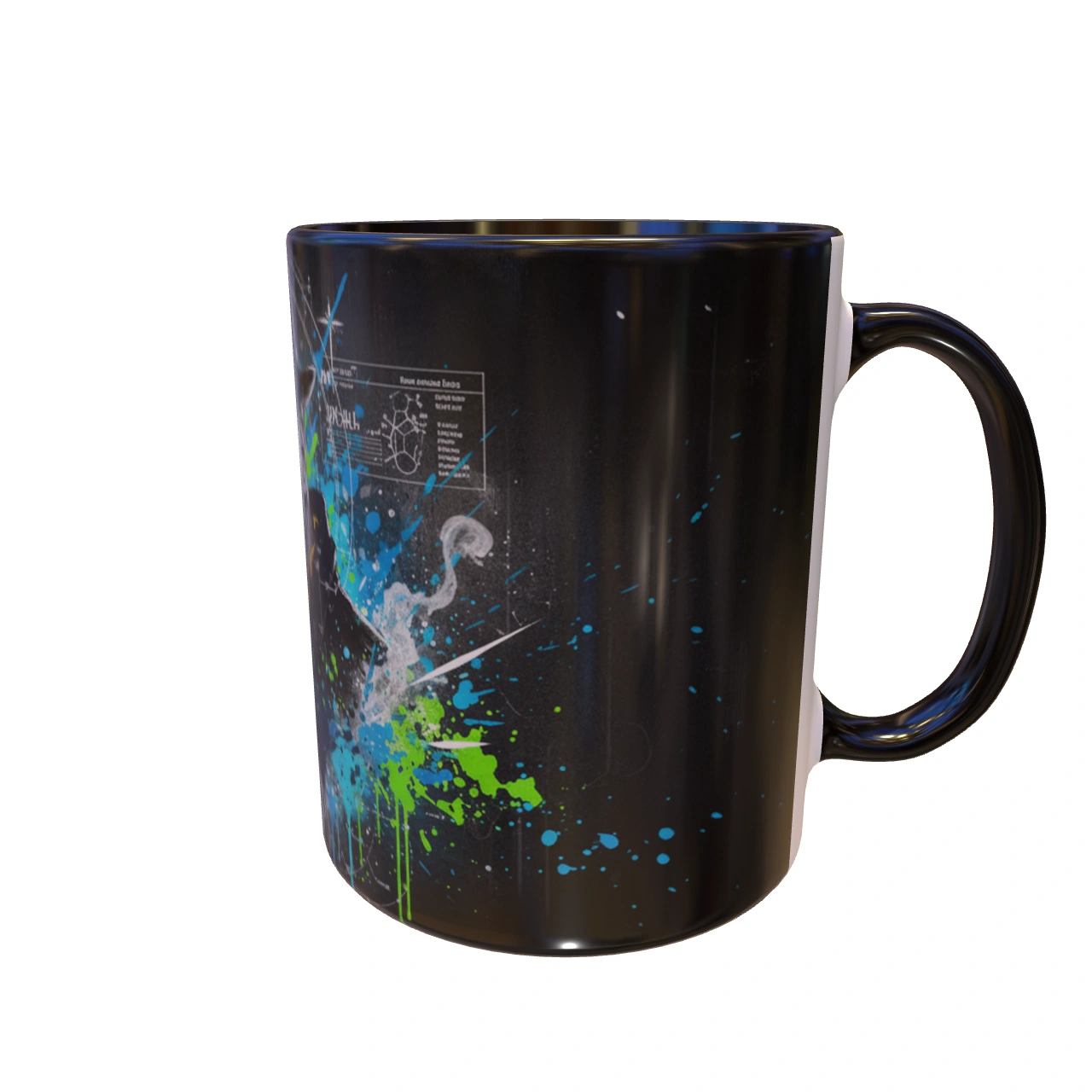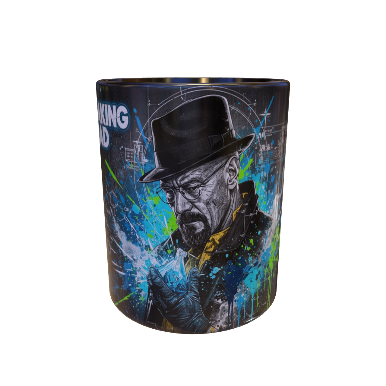 ⚗️ طراحی دوگانه: از معلم تا امپراتور! – یک سمت ماگ، چهره نمادین والتر وایت با کلاه و عینک معروف هایزنبرگ، غرق در افکتهای هنری آبی و سبز قرار دارد. سمت دیگر، لوگوی سریال در کنار ساختارهای مولکولی که داستان را تغییر دادند، خودنمایی میکند. 🎨 هنر شیمی! – این طرح فقط یک تصویر ساده نیست؛ ترکیبی از هنر پاپ (Pop Art) با المانهای علمی است. فرمولهای شیمیایی که در پسزمینه نقش بستهاند، به طرفداران واقعی سریال یادآوری میکنند که همهچیز از علم شروع شد.